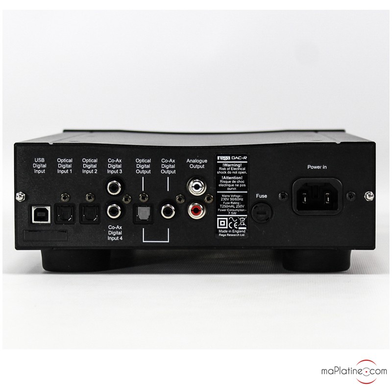 The REGA DAC-R features an asynchronous USB input (24bits -192 Khz), two coaxial digital inputs and two Toslink optical inputs. And on top of that are 2 digital outputs (optical and coaxial) and the RCA audio outputs, of course.