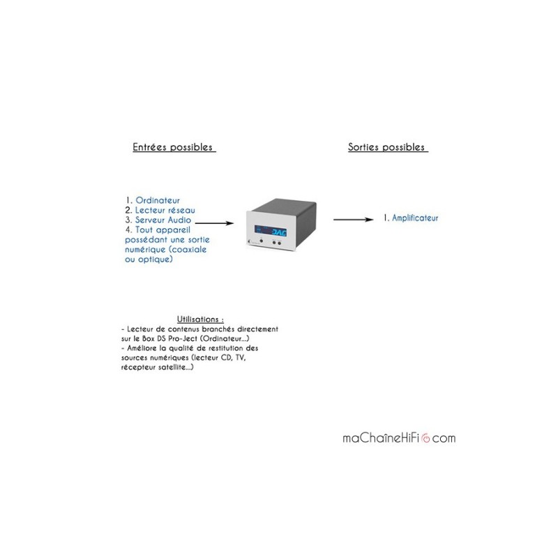 The DAC Box DS converter has an asynchronous USB input (mini USB Audio 2.0), as well as two SPDIF inputs, a coaxial RCA input and an optical input. These inputs accept signals of up to 24 bits/192 kHz. The RCA inputs are gold-plated. It uses a Texas Instruments PCM1792 converter. The digital S/PDIF coaxial and optical inputs use a Logic CS8416 (24 bits/192 kHz) circuit.