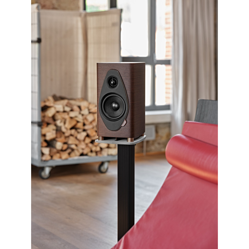The design retains the distinctive boat-hull shape of the latest models, but with numerous modifications. As with all Sonus Faber speakers, the Sonetto I G2 is beautifully crafted, regardless of the chosen finish (Black Lacquer, Wenge, or Walnut). The speaker surrounds are covered in leather. The Sonetto I G2 is a 2-way bass-reflex speaker designed to be placed on a shelf, console, or dedicated stand (Sonus Faber Sonetto Stand G2).