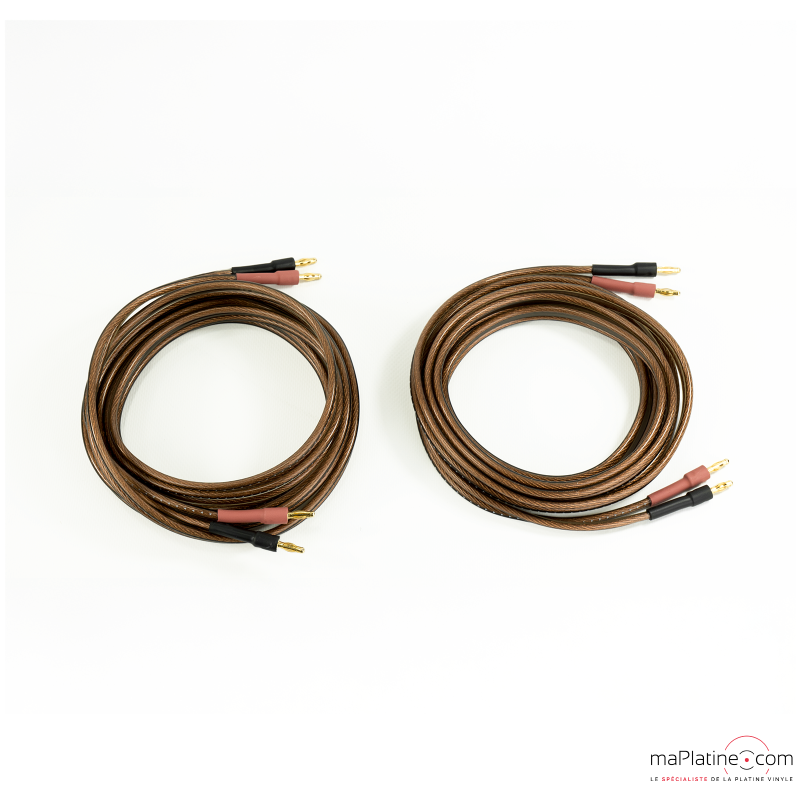 The Elite 300 has an attractive cross-section of 2 x 3 mm2. The conductors are made of OFC copper with a purity of 99.999%. The architecture is fairly complex, with 7 groups of multi-stranded copper. 6 are dedicated to high frequencies and are wound around another section of 7 browns intended for low frequencies. This ‘Time Difference Control (TDC)’ technology compensates for propagation differences between low, medium and high frequencies. This arrangement results in very low capacitance and resistance. The whole unit is housed in a smoked PVC sheath.