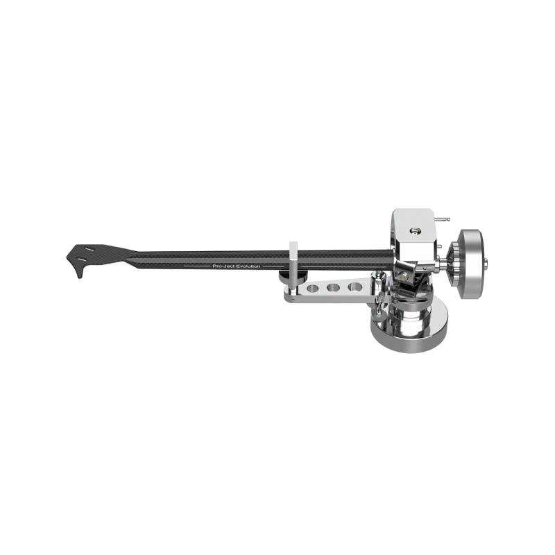 Le tonearm Pro-Ject EVO 9 CC est proposé en finition noire (9 CC Black) ou Chrome (9 CC HG). Il est équipé d’un porte-cellule et d’un tube de bras fabriqués à partir d'une seule pièce de fibre de carbone. Le tube en carbone est maintenu par une seule vis. Elle permet la rotation de ce dernier et affiner le réglage de l'azimut. Le tube du bras montre un profil conique qui évite les réflexions d'ondes stationnaires. Quatre pointes en acier inoxydable montées sur des roulements à billes de qualité ABEC 7 forment les paliers de ce bras à cardan inversé. Le boîtier du roulement du bras est de type annulaire. L'arceau extérieur massif est ouvert pour éviter les résonances.