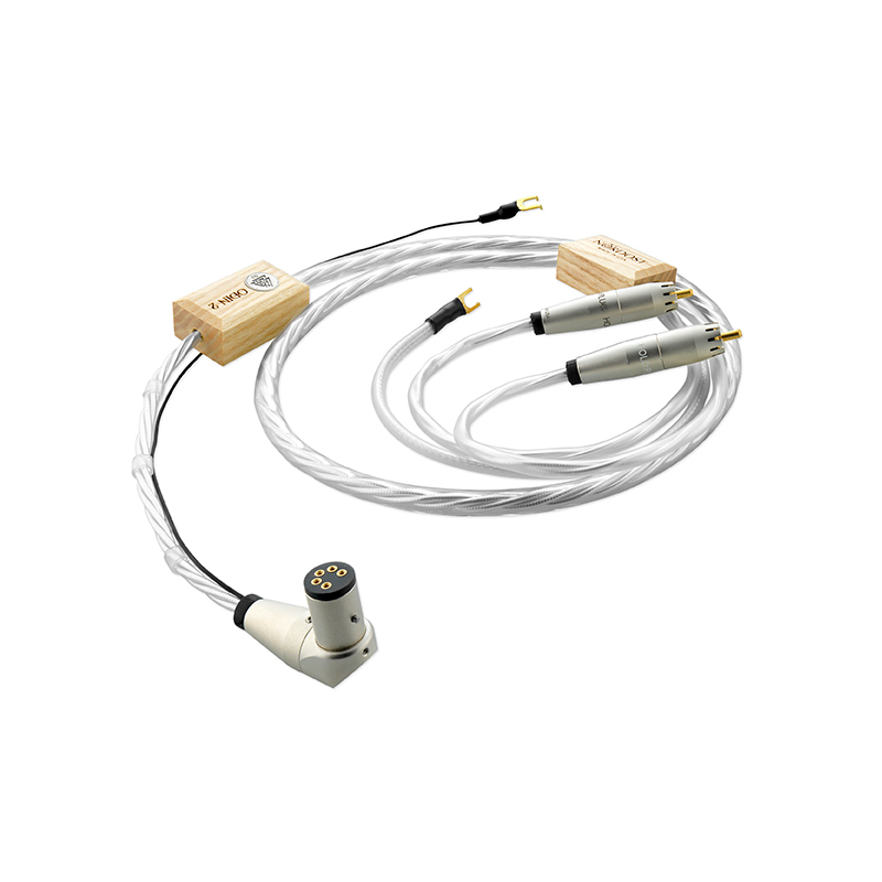 C’est avec cette problématique que Nordost conçoit et fabrique aux Etats Unis cette gamme de câbles dédiés au Phono. Le Nordost Odin Phono bénéficie de tout le savoir faire du constructeur. Ses quatre conducteurs monobrin de 0,26mm² de section sont en cuivre OFC 7N recouvert d’une épaisse couche d’argent. Un ingénieux système suspend les câbles dans une gaine en PTFE, simulant ainsi un parfait isolant sur air. Cette technique permet de limiter considérablement l’effet de peau et l’effet mémoire, réduisant ainsi la distorsion et donnant une restitution très aérée. Son isolation électromagnétique a été particulièrement soignée. Son blindage est total, 100% ! Les connectiques utilisées font partie des meilleures disponibles (RCA Neutrik Nextgen …). A l’arrivée du câble celui-ci est maintenu et amorti par une pièce de bois du plus bel effet.