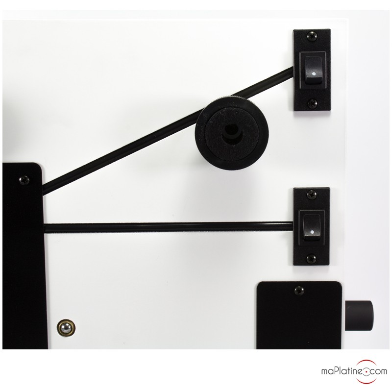 Le changement de vitesse de 33 à 45 tours se fait électroniquement. Le plateau en ABS repose sous un sous plateau entrainé par une courroie.