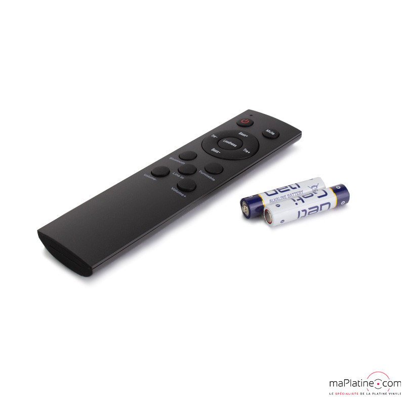 Un bouton de réglage en façade vous permet d’ajuster le volume finement (32 pas de réglage), ou de sélectionner l’entrée adéquate en appuyant dessus. Une télécommande infra-rouge est également incluse, permettant ainsi tous ces réglages à distance.