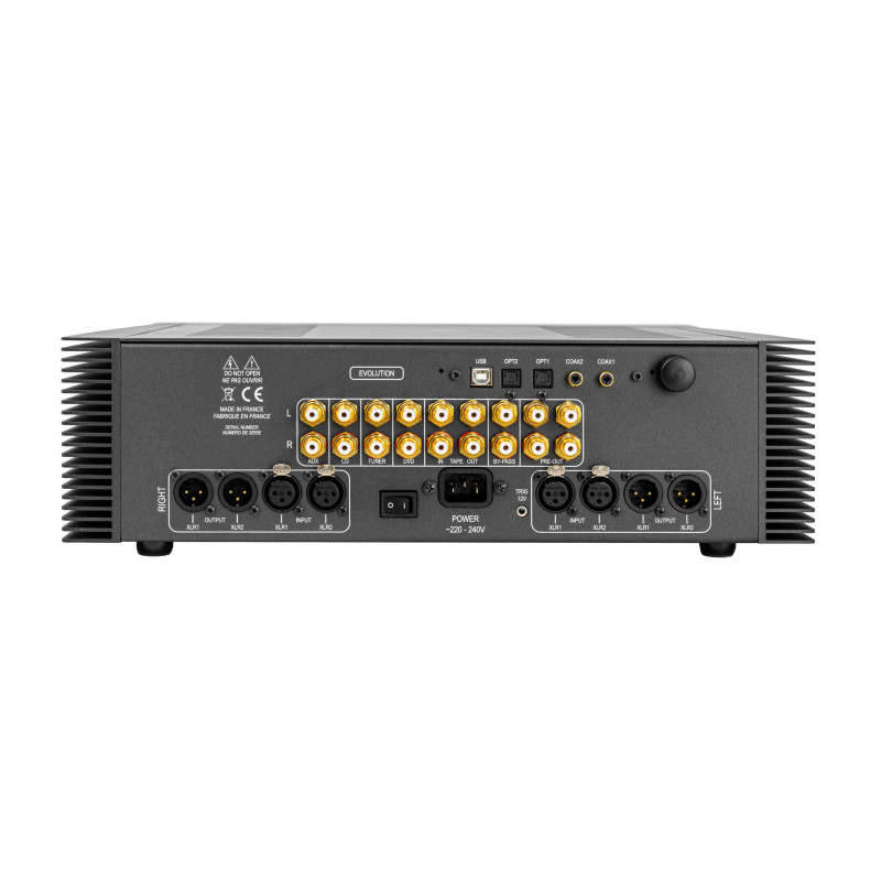 Ces étages symétriques bipolaires sont totalement réalisés avec des composants discrets de très faible tolérance. À ces entrées s’ajoutent 2 sorties pré-out, un By-Pass et un Tape Out.