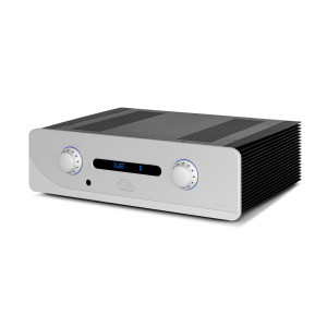 Au centre de la façade trône une fenêtre abritant un afficheur OLED bleu à faible consommation. De chaque côté on trouve un gros potentiomètre logique en aluminium massif : celui de droite gère le volume (par rotation) et la balance (par pression), tandis que celui de gauche gère la sélection de source (par rotation) et le M/A (par pression). Il est à noter qu’il y a un rétroéclairage autour de ces deux boutons que l’on peut définir en rouge, bleu ou violet.